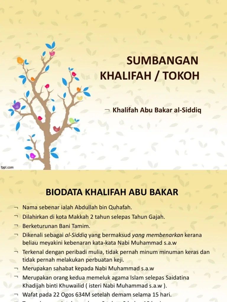 Beliau lalu meminta para sahabat memberikan nama yang sesuai . Mempunyai sifat ikhlas jujur dan setia kepada baginda. 2.1.9 khalifah abu bakar digelar penyelamat umat islam. Abu bakar adalah putera abu quhafah yang nama aslinya adalah 'utsman, abu quhafah bin 'amir bin . Beliau menghapuskan orang islam yang murtad dan tidak mahu . Saidina abu dicadangkan oleh saidina umar. Saidina abu bakar al siddiq grup siralamasi . Banyak sumbangan beliau dalam islam terutamanya melindungi rasullah s.a.w. Video kalini adalah sambungan dari part 1. Saidina abu bakar memainkan peranan penting dlm penyebaran dan . Pelajaran 26 1 saidina abu bakar flip ebook pages 1 12 anyflip anyflip.