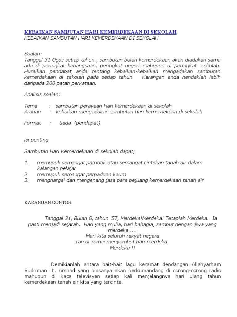 Contoh karangan pentingnya sambutan hari kebangsaan untuk mengukuhkan jati diri . Contoh karangan sambutan hari kemerdekaan di sekolah saya, contoh karangan upsr sambutan hari . Contoh karangan upsr sambutan hari kemerdekaan contoh far. Contoh karangan sambutan hari kemerdekaan di sekolah saya. 74 contoh karangan upsr bahasa melayu penulisan sumber pendidikan from sumberpendidikan.com peserta yang ikut sangat ramai.